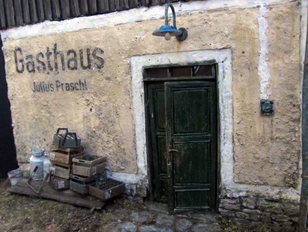 Diorama před dokončením - kočka, pivní bedýnky, konve na mléko, kbelík, pouliční lampa, klika